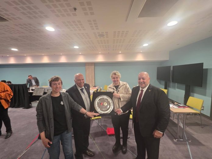 وفي ختام اللقاء، قام خلف الزناتي بإهداء السيدة مايكى فنيرين رئيسة الاتحاد الألمانى للتعليم ، درعاً تذكارياً يحمل شعار نقابة المهن التعليمية، مثمنا التعاون بين نقابة المعلمين المصرية مع الجانب الألماني .